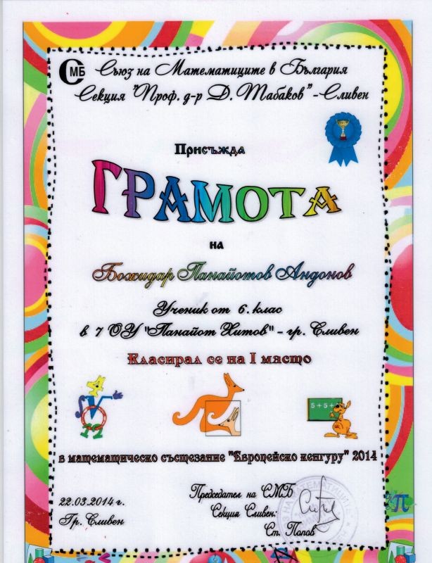 На математическото състезание "Европейско кенгуру", провело се на 22 март, първо място зае нашият ученик Божидар Андонов от VIб клас. Достойно се представи и Стефани Георгиева, също от VIб клас.