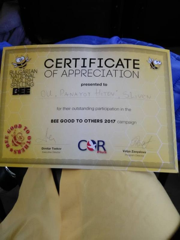 Представители на ОУ „Панайот Хитов“ бяха Берна Мустафова и Виктор Иванов, ученици от 6 Б клас, спечелили съответно първото и второто място на училищния кръг на Spelling bee. Те се представиха блестящо, като показаха не само отлични знания по английски език, но и упоритост, постоянство и голямо желание за победа. Състезанието беше разделено на два кръга. В първия, един срещу друг се изправиха децата, станали на второ място на училищните си кръгове. Нашият предтавител Виктор не носеше четерилистна детелина в джоба си и за жалост беше отстранен. Вторият кръг беше кръгът на титаните. В него участие взеха децата, първенци в училищата си. Представители имаше от 30 регионални училища. Битката беше оспорвана до края, децата показваха завидни знания и силна концентрация, въпреки стреса. Накрая, след сълзи, треперене от вълнение и стискане на палци, упоритата работа на Берна и нейната учителка по Английски език, г-жа Деница Стоева, се увенча с грандиозен успех. След напрегната борба за първо и второ място, Берна умело запази спокойтвие и успя да отмъкне една достойна победа. Завоюва златото с такава лекота, на която би завидял всеки професионален спортист. Това е първо явяване на Регионалните квалификации на Spelling Bee на нашето училище, но Берна им показа как се прави. На второ и трето място останаха съответно Мила Николаева Колева от ППМГ “Добри Чинтулов” и Фиона-Мари Кристофър Тотън от ОУ “Д-р Иван Селимински” . Най-добрите трима от всяко регионално състезание се класират за националния финал на 6 май в София. Финалистите и техните учители ще участват и в летен езиков лагер. ОУ“ П. Хитов“ също бе удостоено с грамоти- една за организиране и подготовка на състезанията на училищно ниво и една за участие в конкурсите на тема „Bee good to others”- за добротворчество. Индивидуални грамоти получиха и всички, взели участие в регионалния кръг, и техните преподаватели по Английски език.