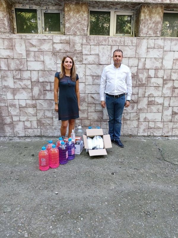 Дарението включва три вида дезинфектанти – за под, за учебните чинове и за ръце, както и кутии с предпазни маски за деца и възрастни.