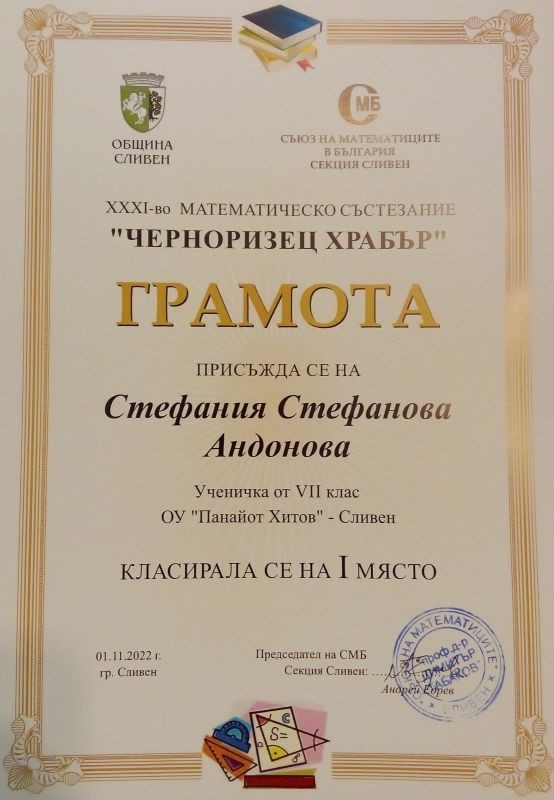 На провелото се на 1.11.2022 г. XXXI-во математическо състезание "Черноризец Храбър", Стефания Андонова от VII А клас спечели златен медал, като се отличи сред конкуренцията си в своята възрастова група с максимален брой точки. На 25.11.22 г. /петък/ в сградата на РУО-Сливен се състоя награждаването на учстниците, където присъстваха учители, родители и експерти. Поздравяваме Стефи за винаги отличните резултати и ѝ пожелаваме успех на предстоящите предизвикателства!